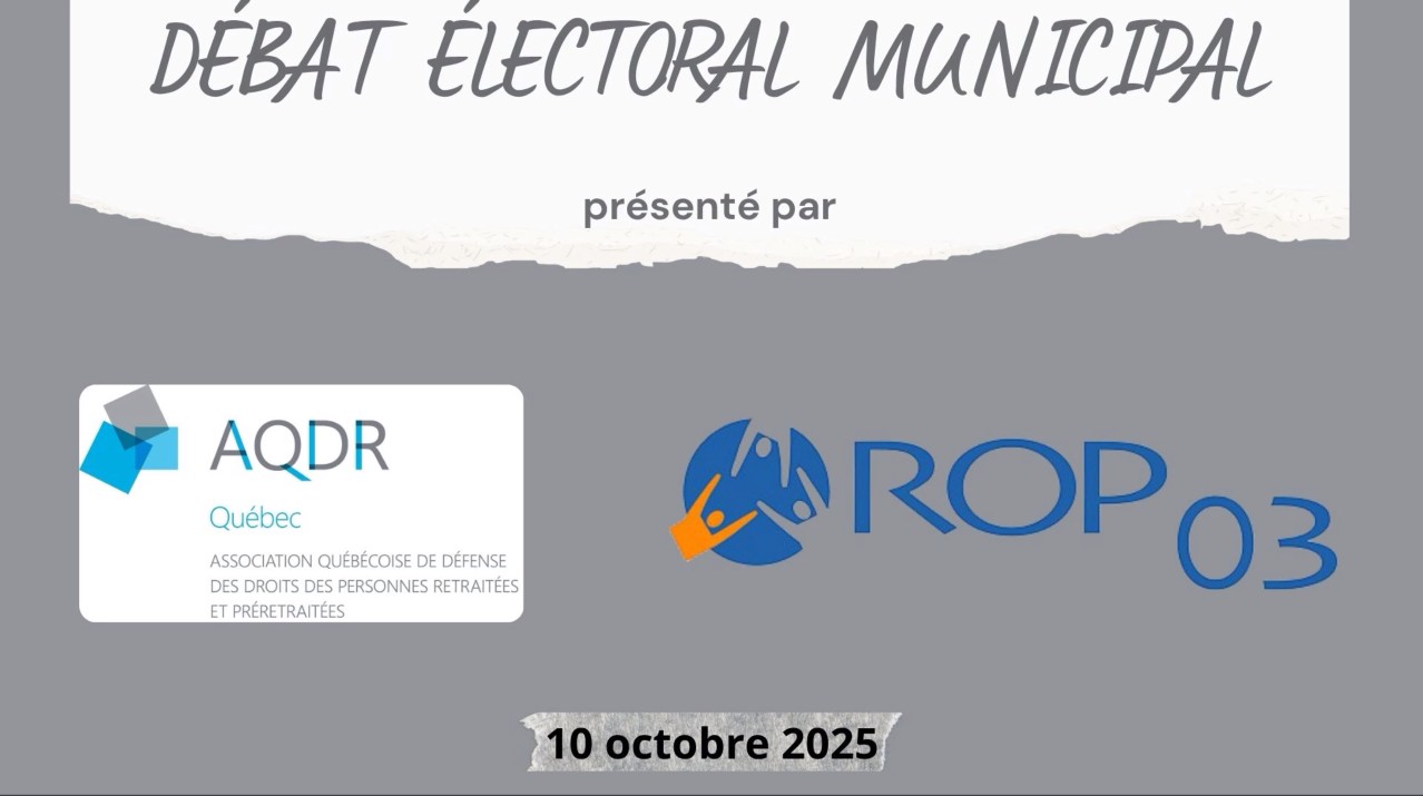 Dans le cadre des élections municipales, le ROP03 et l’AQDR Québec ont organisé ce débat électoral ayant comme titre La place des personnes ainées et des personnes handicapées dans la Ville de Québec : Enjeux et Engagements. Ce débat a eu lieu le 10 octobre 2025 à partir de 13h30 en mode hybride (présentiel Pavillon de la Pointe-aux-Lièvres, 51, rue de la Pointe-aux-Lièvres et en ligne sur la plateforme Teams) Thématiques abordées lors de ce débat : Participation sociale et citoyenne ; Sécurité des personnes aînées et des personnes handicapées ; Habitation abordable, accessible et adaptée ; Mobilité, aménagement urbain et sécurité ; Transport collectif accessible et abordable. Animateur: Mario Bousquet Les invités Marie-Pierre Boucher, candidate Arrondissement de Charlesbourg (Louis-XIV) : Québec forte et fière Véronique Dallaire, candidate Arrondissement des Rivières (Les Saules-Les Méandres): Québec d'abord Sam Hamad, candidat à la mairie : Leadership Québec - Équipe Sam Hamad Jackie Smith, candidate à la mairie : Transition Québec Claude Villeneuve, candidat à la mairie : Québec d'abord